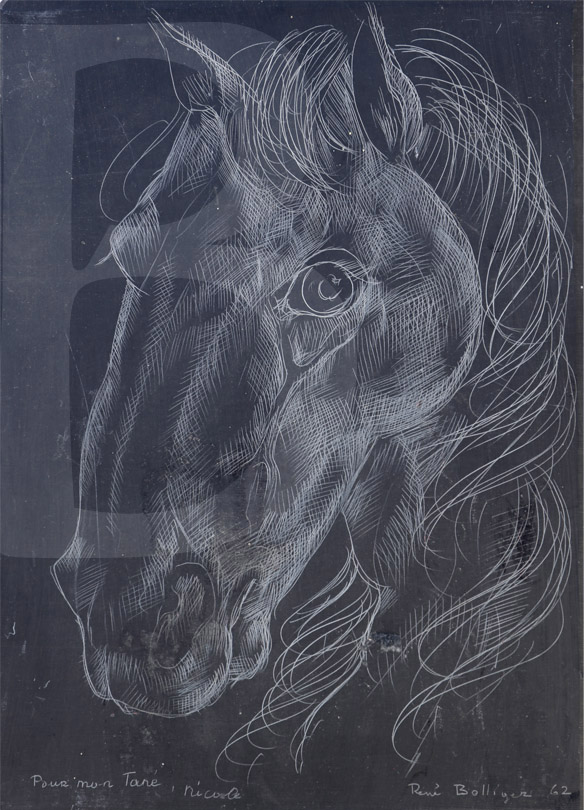 | René Bolliger Portrait de cheval Dessin gravé à la pointe de diamant sur une plaque d'ardoise -1962 21x29cm 350 euros |